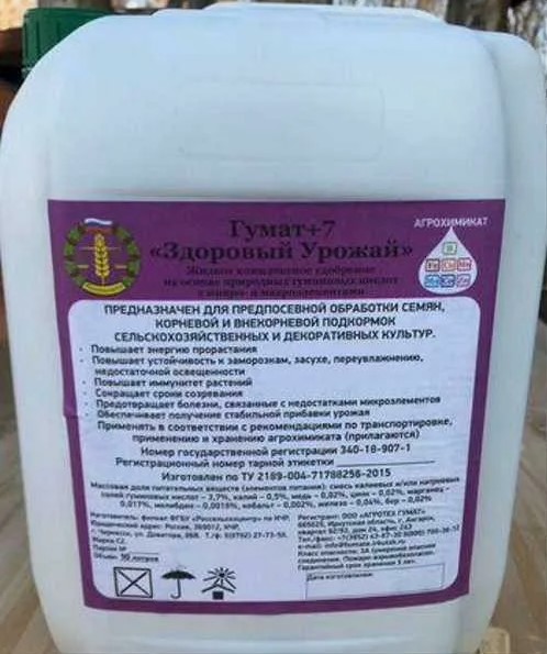Применяют Гумат+7 «Здоровый урожай» для предпосевной обработки семян и посадочного материала, полива и опрыскивания растений в период вегетации. Применение Гумата+7 «Здоровый урожай» позволяет получать стабильные урожаи даже при неблагоприятных погодных условиях: жара-заморозки, засуха-переувлажнение, недостаточное количество солнечных дней.